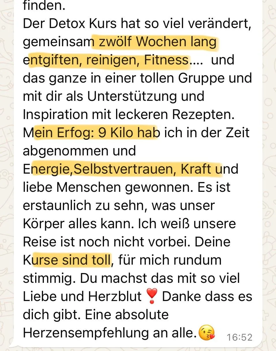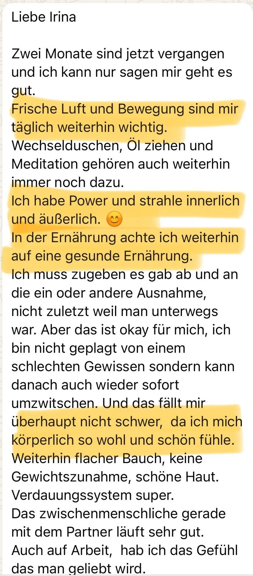 "Der Kurs hat so viel verändert, gemeinsam zwölf Wochen lang entgiften, reinigen, neue Routinen entwickeln…. und das ganze in einer tollen Gruppe und mit dir Irina als Unterstützung. Mein Erfog: 9 Kilo weniger, mehr Energie, Selbstvertrauen und Kraft. Deine Kurse sind toll, für mich rundum stimmig. Du machst das mit so viel Liebe und Herzblut ❣️ Danke dass es dich gibt. Eine absolute Herzensempfehlung an alle."