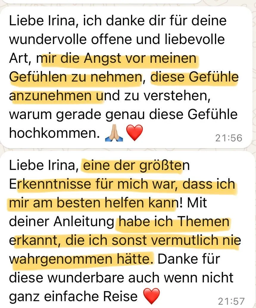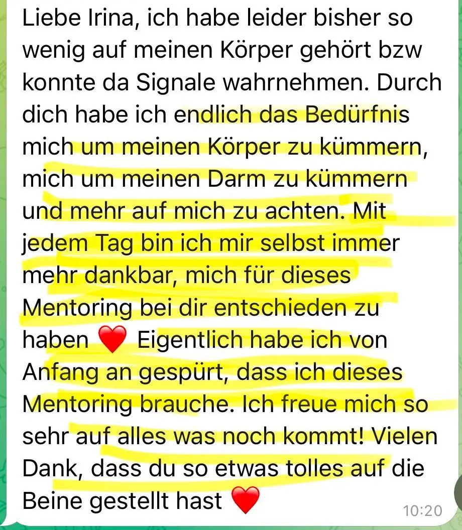 “Liebe Irina, vielen Lieben Dank für die sehr emotionale Reise mit dir. Danke für die letzten drei Monate mit höhen und tiefen. So richtig kann ich noch nicht fassen das das 1:1 Mentoring schon zu Ende ist. Es war heute ein wundervoller Abschluss mit einem tollen Austausch, liebevoll zubereitetem Essen und mal wieder einer emotionalen Session. Mir liefen so die Tränen. Ich bin dankbar und froh dich Kennengelernt zu haben.”